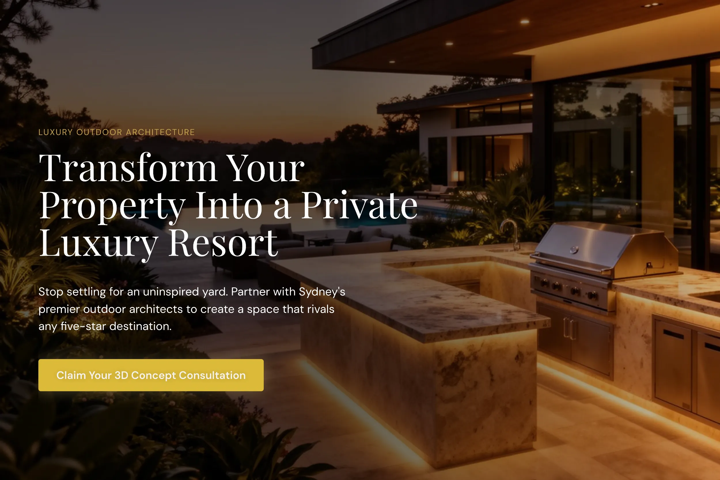 A luxury outdoor design firm targeting high-net-worth homeowners. The page needed to sell a $100K+ service to casual browsers, pre-qualifying leads while keeping the positioning exclusive.