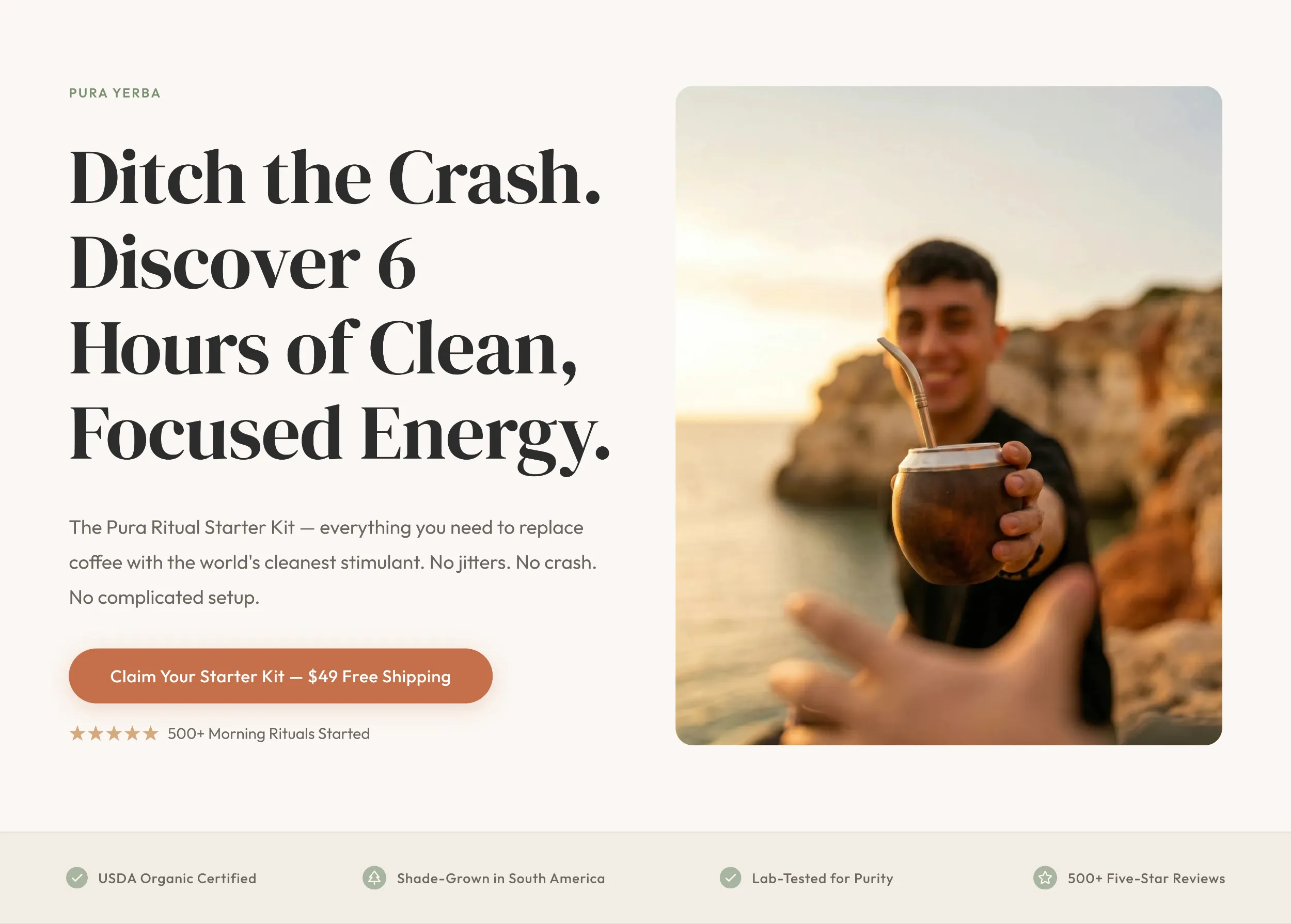 A DTC yerba mate brand entering a market where most buyers are loyal to coffee. The page needed to convert skeptics who don't yet believe they have a problem worth solving.